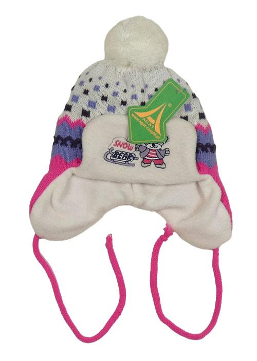Nové - Bílo-fialovo-tmavorůžová vzorovaná vlněná čepice s medvědem a bambulí