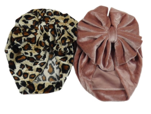 2x - Turbanová sametová čepice s mašlí - Béžovo/hnědo/černá vzorovaná, starorůžová