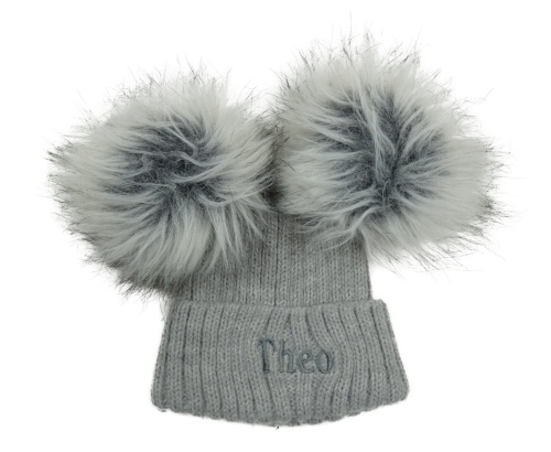 Šedá melírovaná žebrovaná pletená čepice s nápisem a bambulemi