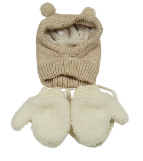 • 2 set - béžová pletená zateplená kukla + smetanové huňaté palcové rukavice