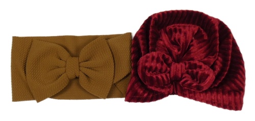 2Set - Hnědá vzorovaná čelenka s mašlí + tmavočervená žebrovaná sametová turbanová čepice s mašlí