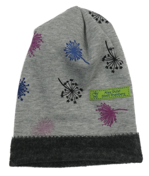 Šedo-tmavošedá melírovaná šmoulí teplá čepice s pampeliškami a nášivkou