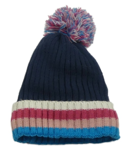 Tmavomodrá pletená čepice s růžovo-modrým pruhovaným lemem a bambulí