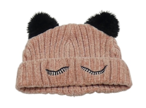 Pudrová melírovaná žebrovaná žinylková čepice s řasami a bambulemi