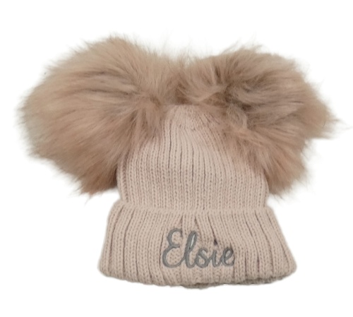 Růžová čepice s bambulemi a nápisem