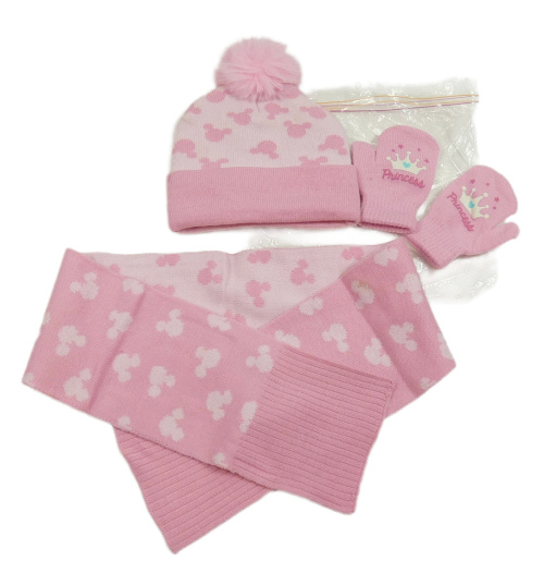 Nové - 3Set - Světlerůžovo-růžová čepice s Mickey a bambulí + šála + palcové rukavice s korunkou Disney