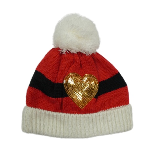 Černo-bílá pletená čepice se srdcem z flitrů a bambulí Tu