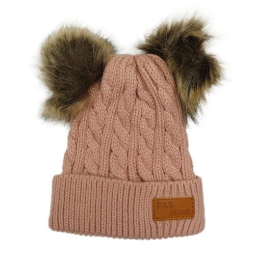 Skořicová žebrovaná vzorovaná pletená čepice s nášivkou a bambulemi
