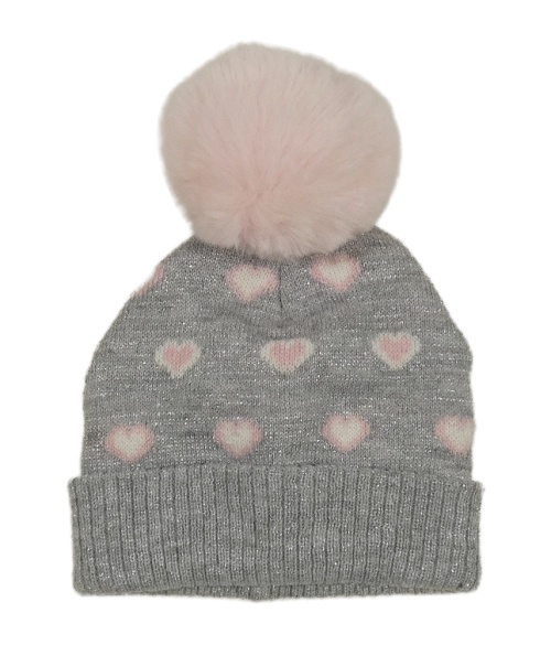 Šedo-růžová pletená čepice se srdíčky a bambulí