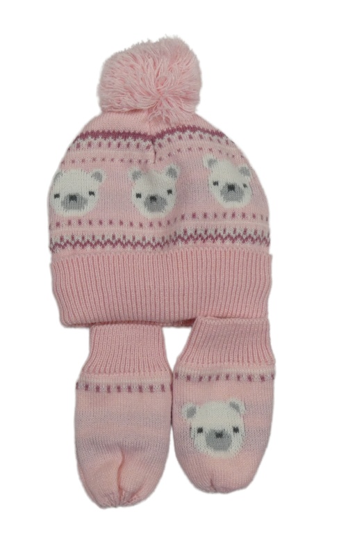2Set - Světlerůžová pletená čepice s medvídky a vzorem a bambulí + rukavice Nutmeg