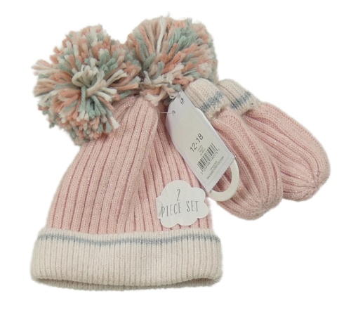 Nové - 2Set - Světlerůžovo-bílá žebrovaná čepice se třpytkami a bambulemi + rukavice George