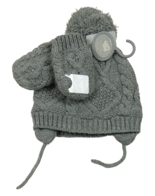 • Nové - 2 set - šedá vzorovaná pletená čepice s bambulí + rukavice Primark
