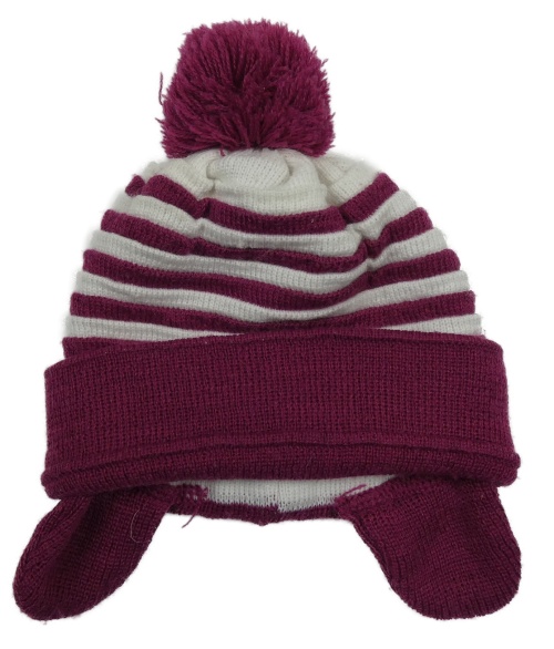 Víšňovo-bílá pruhovaná pletená zateplená čepice s bambulí