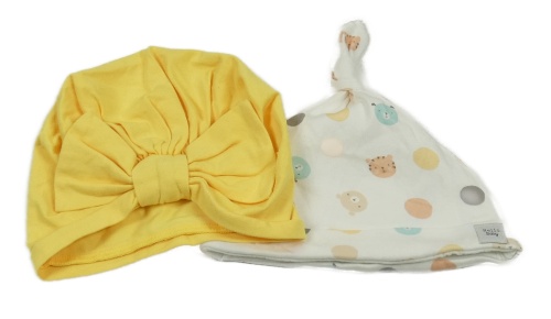 2x bavlněná čepice - žlutá turbanová s mašlí + smetanová puntíkatá se zvířaty