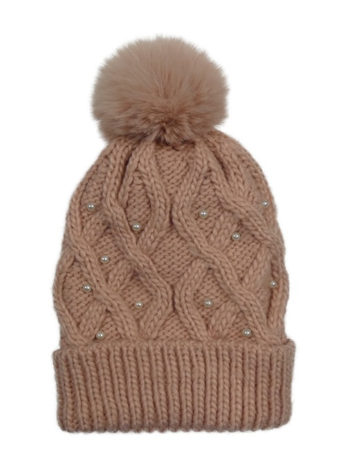 Světlerůžová vzorovaná čepice s perličkami a bambulí