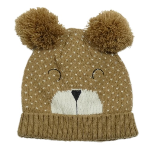 Béžová pletená podšitá čepice s medvídkem a bambulemi Peacocks