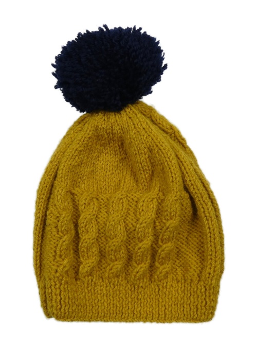Okrová vzorovaná pletená čepice s tmavomodrou bambulí