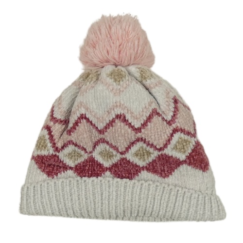 Světlešedo-růžová žinylková čepice se vzorem a bambulí