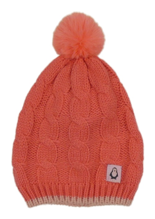 Korálová žebrovaná/vzorovaná pletená čepice s tučňáčkem a bambulí lupilu