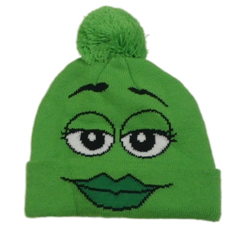 Zelená čepice s očima a pusinkou - m&m's a bambulí
