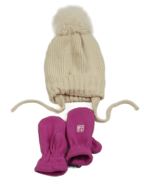 2 set - růžové fleecové palcové rukavice + smetanová pletená podšitá čepice s bambulí