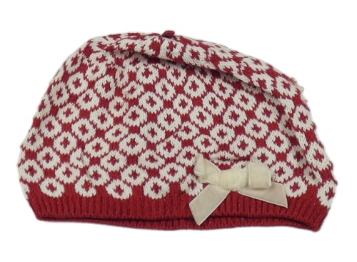 Vínovo-bílá vzorovaná pletená čepice s mašlí