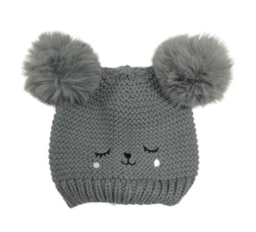 Šedá pletená čepice s čumáčkem a bambulemi