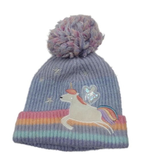 Světlefialovo/světlemodrá žebrovaná čepice s jednorožcem a bambulí George