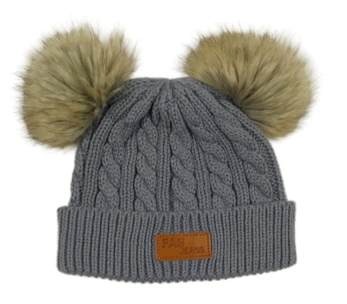 Šedá vzorovaná pletená čepice s nášivkou a bambulemi