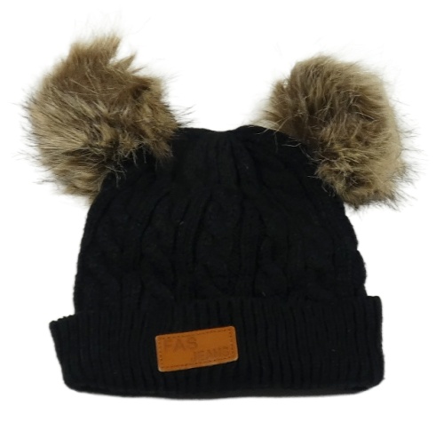 Černá vzorovaná pletená čepice s nášivkou a bambulemi