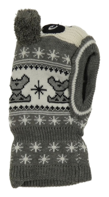 Bílo-šedá vzorovaná pletená kukla s čumákem a 3D bambulemi