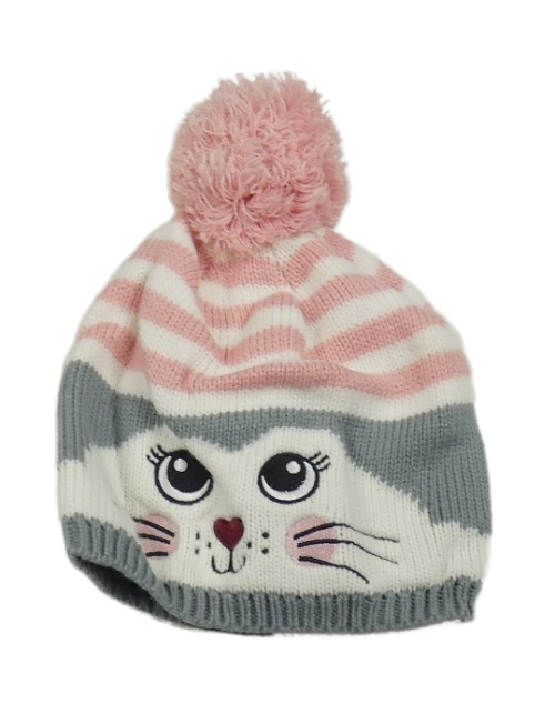 Šedo-pruhovaná čepice s kočkou a bambulí