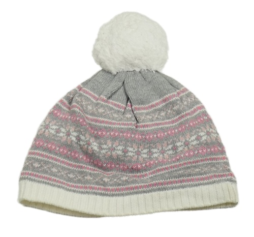 Šedo-růžovo-bílá vzorovaná čepice s bambulí