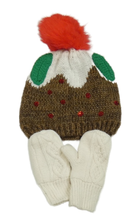 2set - Hnědá čepice s pudinkem + smetanové pletené palcové rukavice