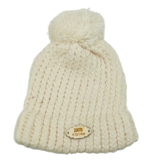 Smetanová čepice s nášivkou a bambulí