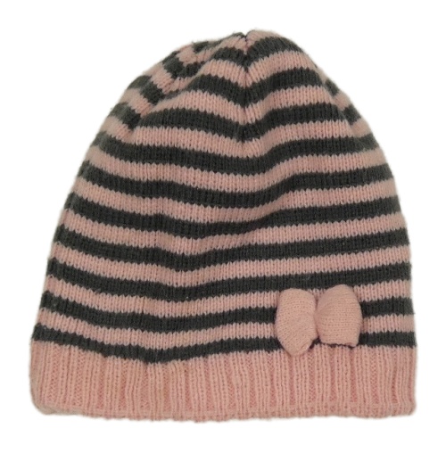 Šedo-růžová pruhovaná pletená podšitá čepice s mašlí