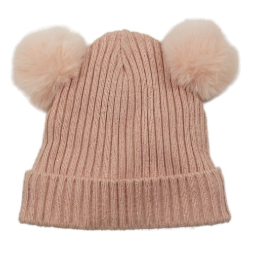 Růžová pletená třpytivá podšitá čepice s bambulemi