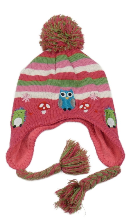Růžovo-bílo-zelená úpruhovaná čepice se sovou a bambulí