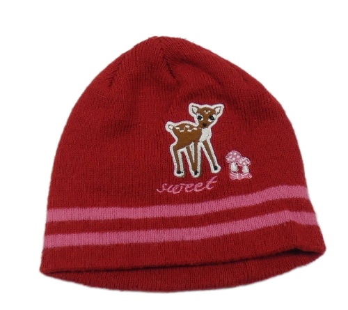 Červená pletená čepice se srnkou a muchomůrkami a pruhy