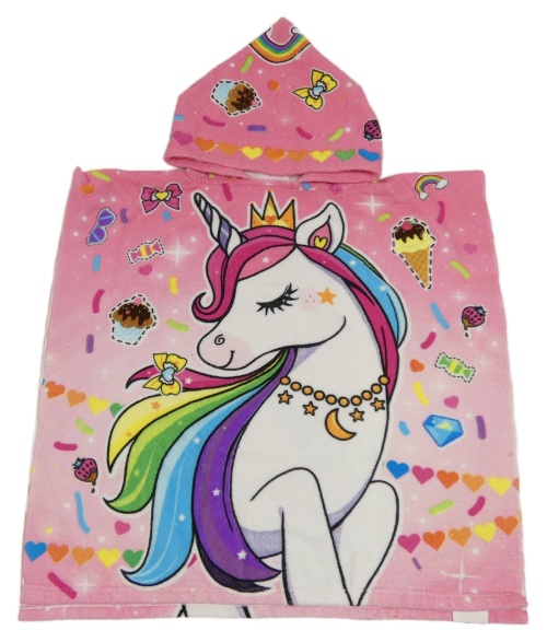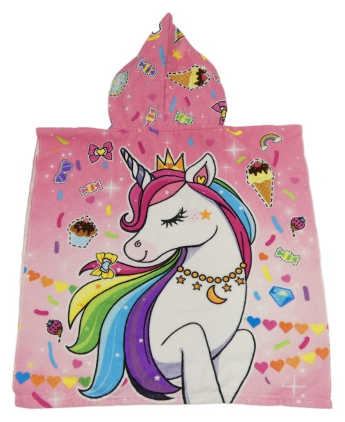 Světlerůžovo-růžová froté osuškové pončo s jednorožcem a kapucí