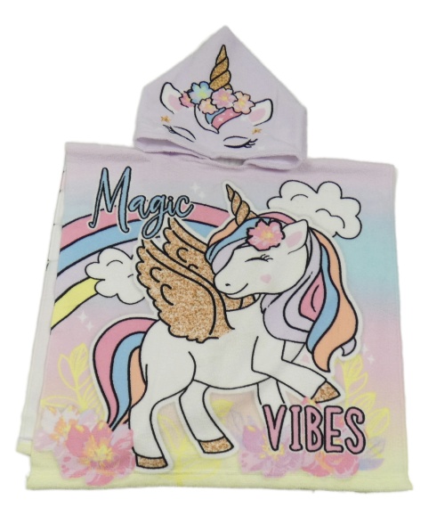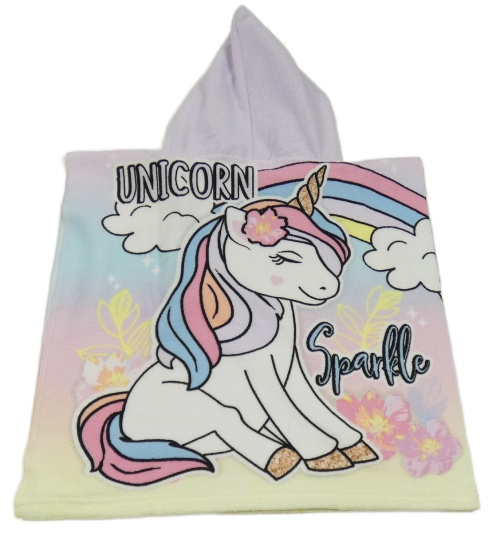 Lila-žluté osuškové pončo s jednorožcem a kapucí