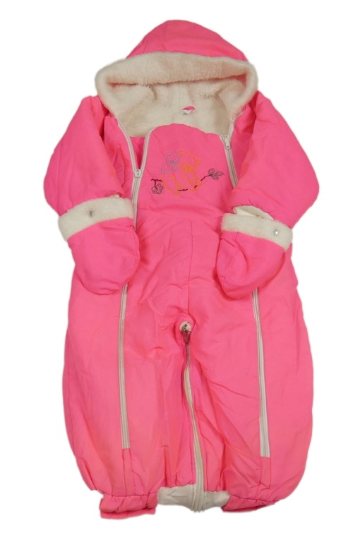 Neonově růžový šusťákový zimní fusak s kapucí a odepínacími rukavicemi