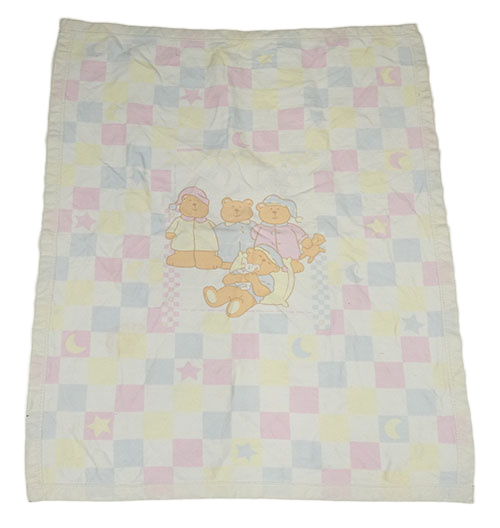 Bílo-světlemodro/růžovo/žlutá kostkovaná deka s medvídky