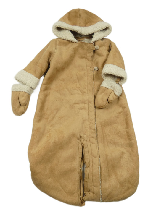 • Hnědý semišový zateplený fusak/kombinéza s kapucí + palcové rukavice