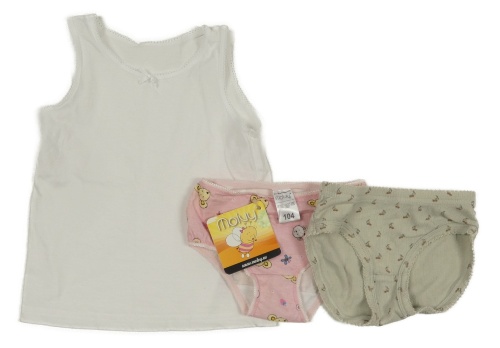 • Nové - 3Set - Bílá košilka s mašličkou + 2x - kalhotky - růžové se zvířátky a jahůdkami, šedobéžové vzorované s třešničkami