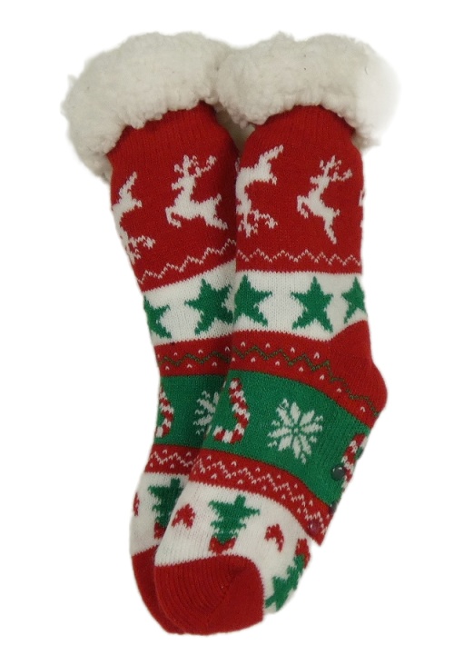 Nové - Červeno-bílo-zelené vzorované zateplené domácí ponožky vel. 29-32