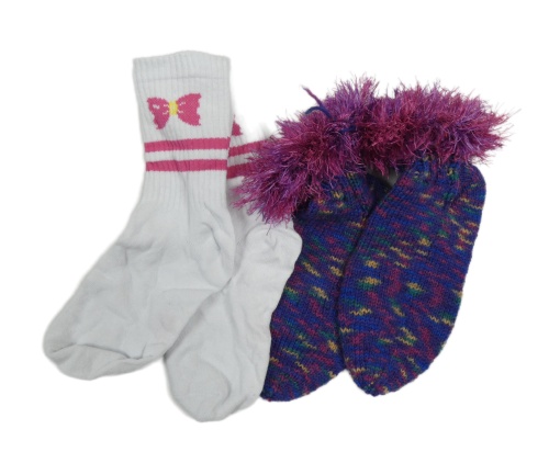 • 2x - Ponožky - Bílé s motýlkem a pruhy vel. 31-34, barevné pletené s chlupatým kanýrkem