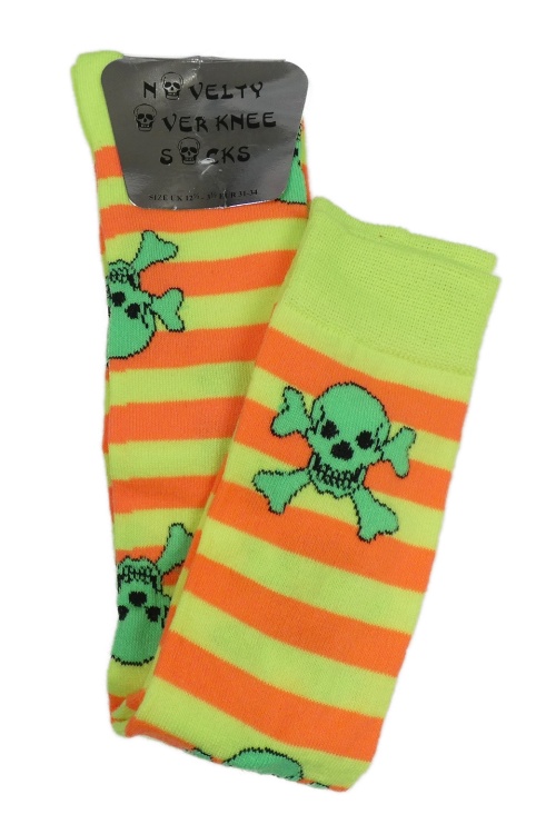 Nové - Neonově žluto-oranžové pruhované nadkolenky s lebkami vel. 31-34