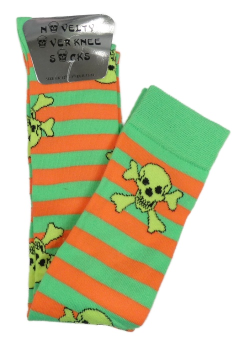 Nové - Neonově zeleno-oranžové pruhované nadkolenky s lebkami vel. 31-34