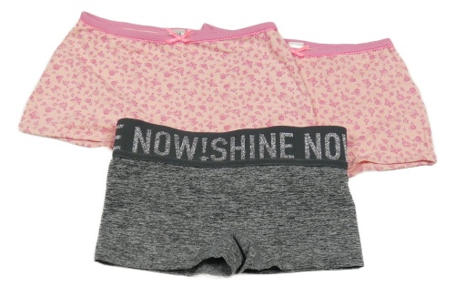 3x kalhotky - 2x růžové květované s motýly + tmavošedé melírované
